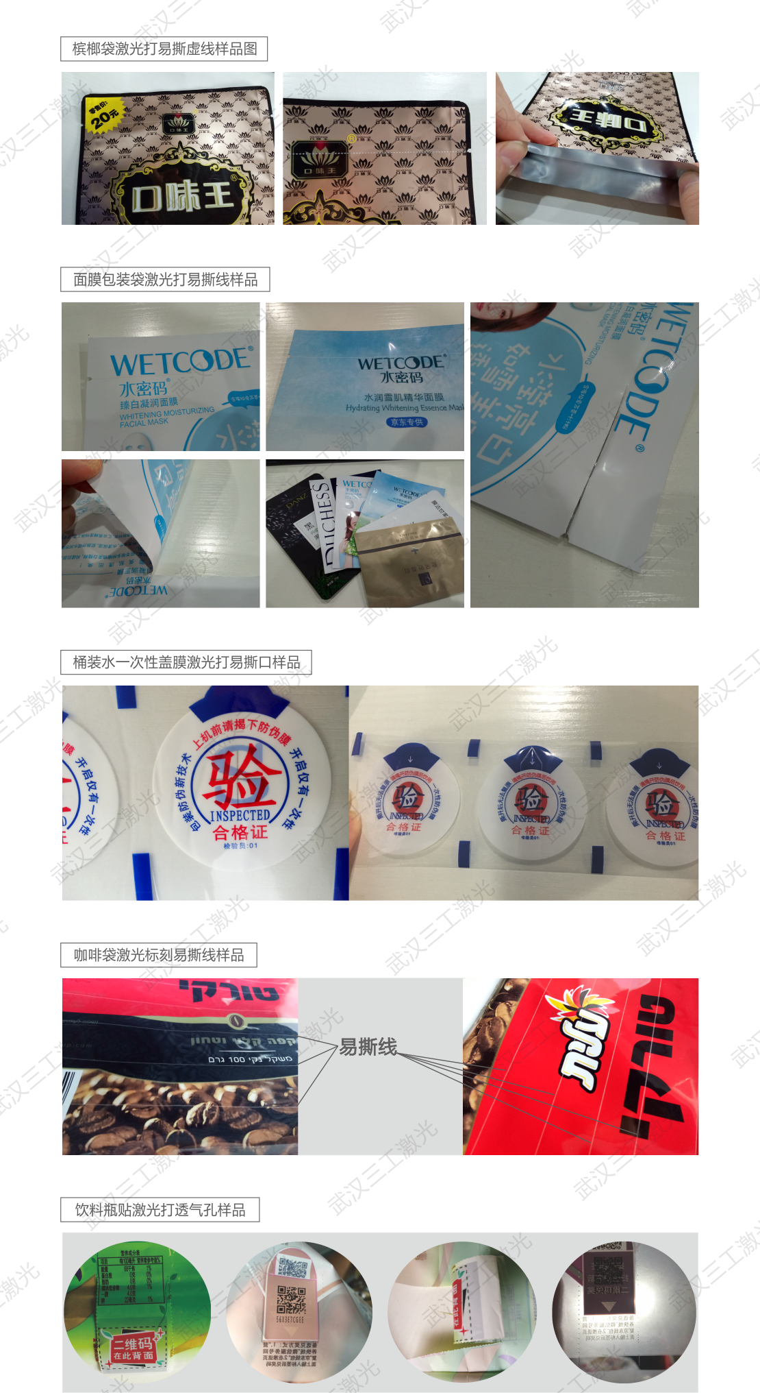 武漢三工激光是國(guó)內(nèi)率先針對(duì)薄膜包裝行業(yè)提出激光代替機(jī)械加工工藝的企業(yè),專為薄膜易撕線、定量透氣孔而設(shè)計(jì)與開發(fā)的。與傳統(tǒng)的機(jī)械齒輪壓孔相比速度更快,孔徑孔距大小可調(diào)更加均勻,可以實(shí)現(xiàn)任意方向任意形狀易撕孔(線)標(biāo)刻。激光工藝制作是一種瞬間高溫處理使孔周圍熱融保護(hù),因此完全解決了后期熱收縮后出現(xiàn)的斷裂現(xiàn)象,在手感上也非常平滑,在感官上給客戶一種新的體驗(yàn)。激光易撕線和透氣孔的諸多優(yōu)勢(shì)我們前面已經(jīng)講到過(guò)很多,再次不做贅述,下面一起來(lái)看一下我們易撕線激光打孔劃線機(jī)做的不同行業(yè)以及材料的樣品吧!